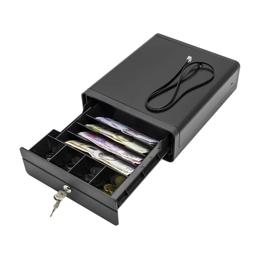 Надкомпактна грошова скринька з можливістю відкриття через інтерфейс RJ11 (за допомогою імпульсу від чекового принтера або касового апарату). Ця скринька для грошей, завдяки своїм невеликим розмірам, чудово підійде для торгових точок, що знаходяться в обмеженому просторі. Для економії місця використовується вертикальний спосіб розкладки купюр з чотирма повнорозмірними відсіками для банкнот. Монетам призначено 4 окремі відсіки.
